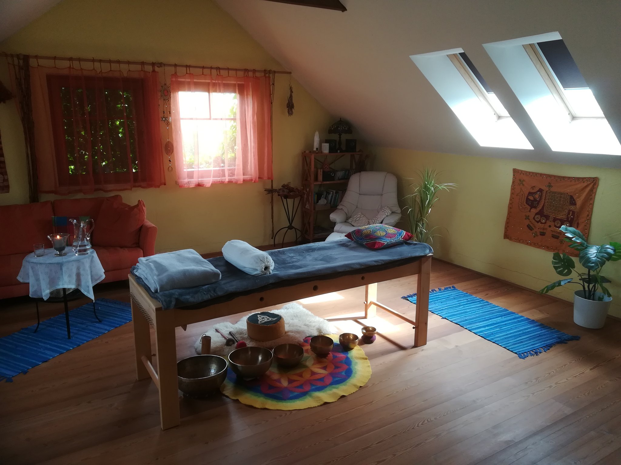 Ob in der kleinen Gruppe bei einer Klangreise mit musiktherapeutischen Instrumenten, bei einer Einzelbehandlung auf der Klangliege oder einer Klangschalen Massage.